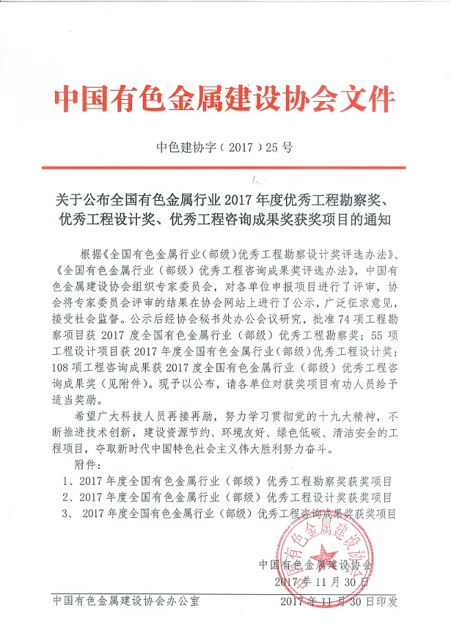 熱烈祝賀我公司兩項(xiàng)目榮獲全國有色金屬行業(yè)2017年度優(yōu)秀工程勘察獎(jiǎng)