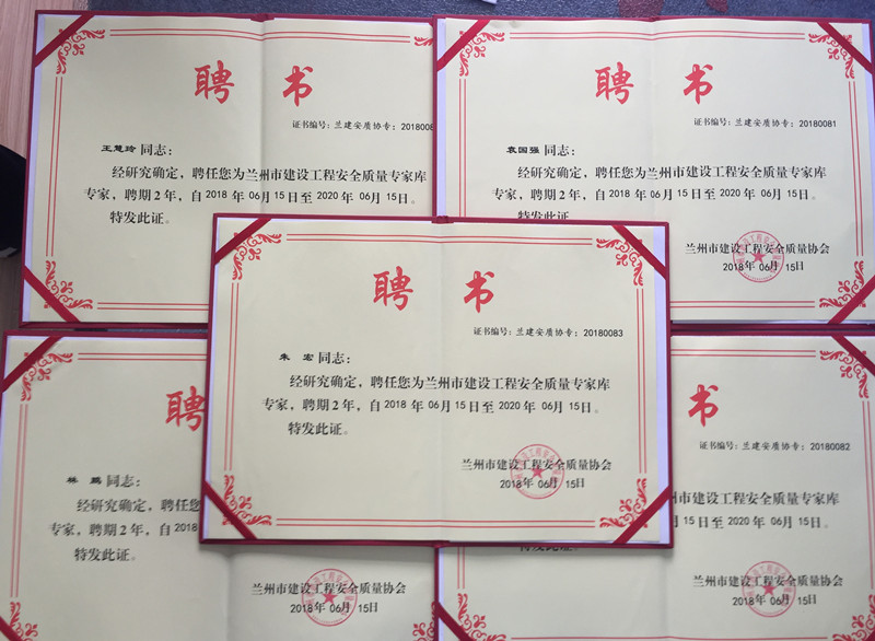 我公司于2018年4月申請(qǐng)成為蘭州市建設(shè)工程安全質(zhì)量協(xié)會(huì)會(huì)員單位。該協(xié)會(huì)為進(jìn)一步我市建設(shè)工程安全質(zhì)量管理水平,完善和規(guī)范工程安全質(zhì)量專(zhuān)家隊(duì)伍建設(shè),充分發(fā)揮專(zhuān)家在工程安全質(zhì)量檢查、咨詢(xún)、評(píng)價(jià)和指導(dǎo)等方面的作用,有效防范安全生產(chǎn)事故,更好地為企業(yè)和政府主管做好服務(wù),根據(jù)住建部37號(hào)令《危險(xiǎn)性較大的分部分項(xiàng)工程安全管理規(guī)定》我公司呂永平、朱宏、王惠玲、林鵬、袁國(guó)強(qiáng)被聘任為蘭州市建設(shè)工程安全質(zhì)量專(zhuān)家?guī)鞂?zhuān)家。