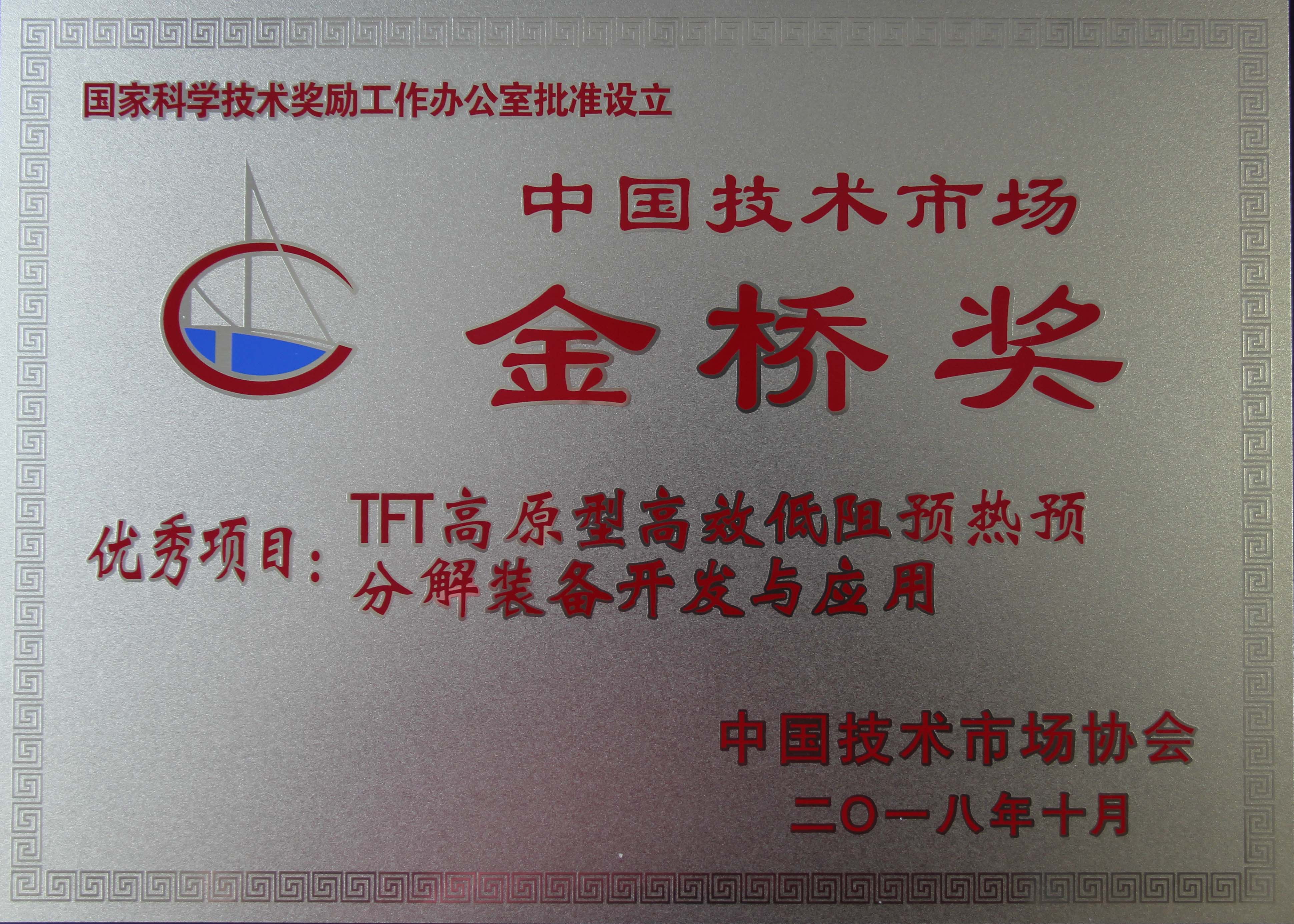 第九屆中國技術(shù)市場協(xié)會金橋獎頒獎大會于2018年10月31日在北京召開,我公司繼上屆榮獲先進(jìn)集體獎后,今年申報(bào)的“TFT高原型高效低阻預(yù)熱預(yù)分解裝備開發(fā)與應(yīng)用”項(xiàng)目經(jīng)第九屆中國技術(shù)市場協(xié)會金橋獎評審委員會評審,榮獲優(yōu)秀項(xiàng)目獎。