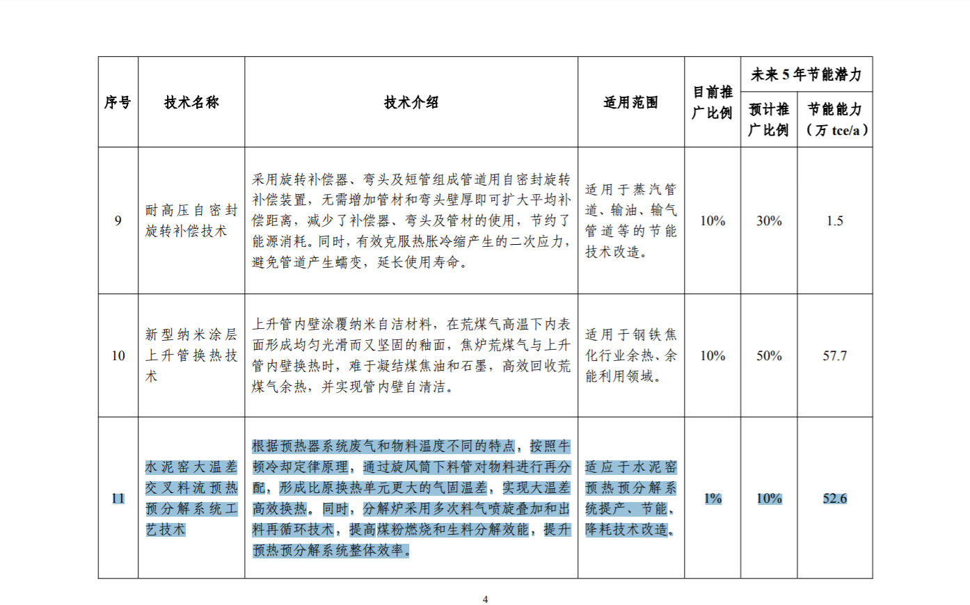 該技術(shù)適應(yīng)于水泥窯預(yù)熱預(yù)分解系統(tǒng)提產(chǎn)、節(jié)能、降耗技術(shù)改造。可以提高熟料產(chǎn)量 10~25%;提高熟料強(qiáng)度 1.0~3.5MPa;降低燒成煤耗 2.9~4.5kgce/t;降低綜合電耗 3.5~5.0kW·h/t;降低廢氣中 NOx含量 100~150ppm。預(yù)計(jì)未來(lái) 5 年,推廣應(yīng)用比例可達(dá)到 10%,可形成節(jié)能52.61 萬(wàn) tce/a,減排 CO2 136.79 萬(wàn) t/a。