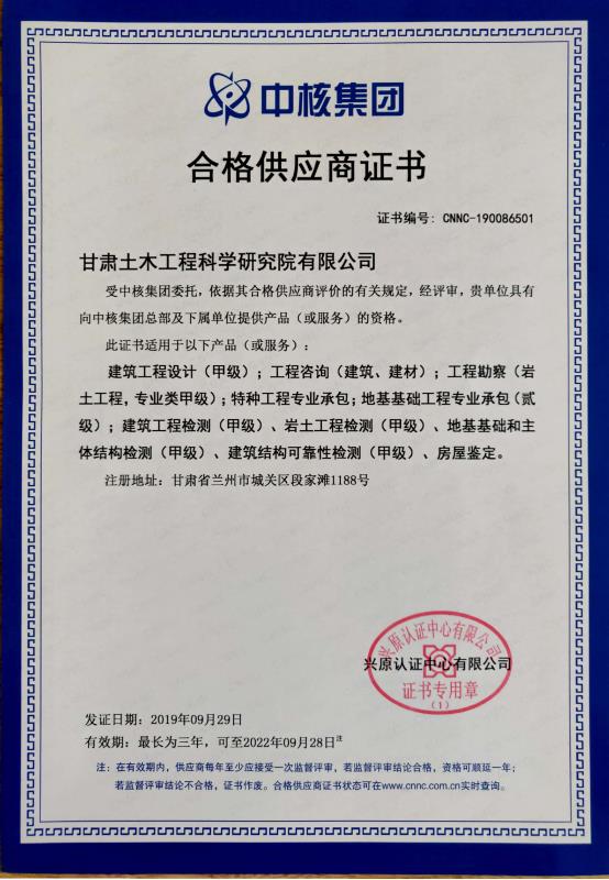近日,公司成功通過中核集團(tuán)興原認(rèn)證中心有限公司和中核集團(tuán)合格供應(yīng)商專家委員會(huì)及管理委員會(huì)審核認(rèn)證,順利獲得建筑工程設(shè)計(jì)(甲級(jí));工程咨詢(建筑、建材);工程勘察(巖土工程,專業(yè)類甲級(jí));特種工程專業(yè)承包;地基基礎(chǔ)工程專業(yè)承包(貳級(jí));建筑工程檢測(甲級(jí))、巖土工程檢測(甲級(jí))、地基基礎(chǔ)和主體結(jié)構(gòu)檢測(甲級(jí))、建筑結(jié)構(gòu)可靠性檢測(甲級(jí))、房屋鑒定的合格供應(yīng)商資格。