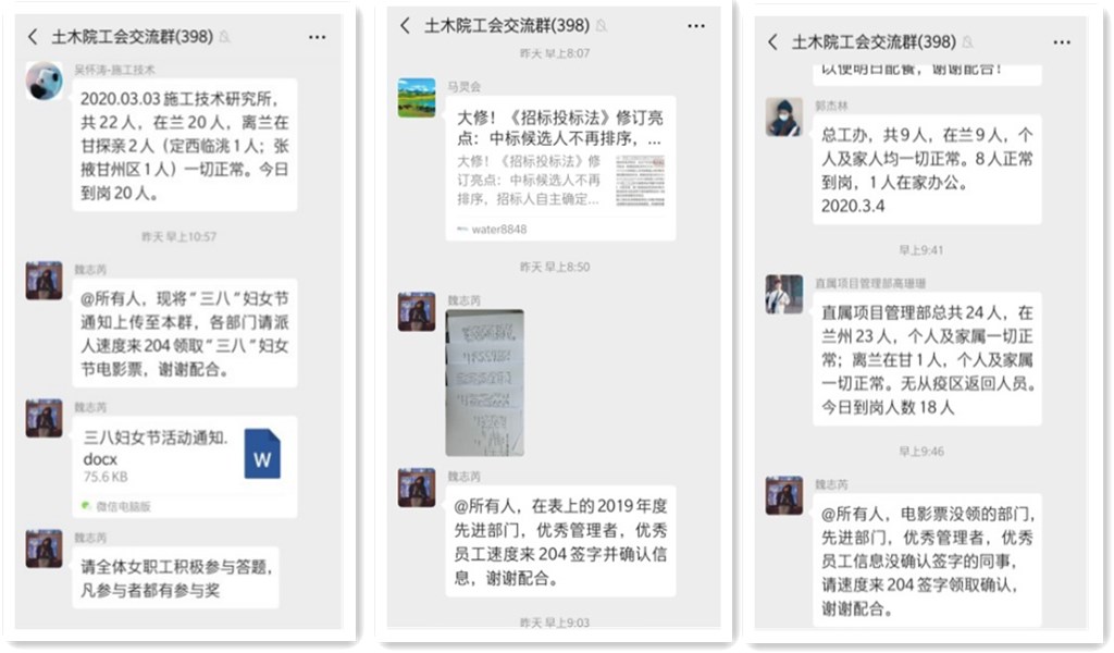 依托微信平臺,加強(qiáng)對公司日常工作管理、信息發(fā)布、疫情發(fā)展趨勢、職工人員信息進(jìn)行收集管理,做好日常管理、防控、監(jiān)督、宣傳工作。