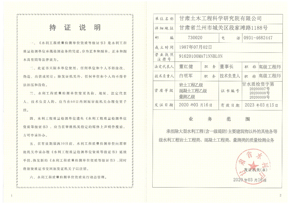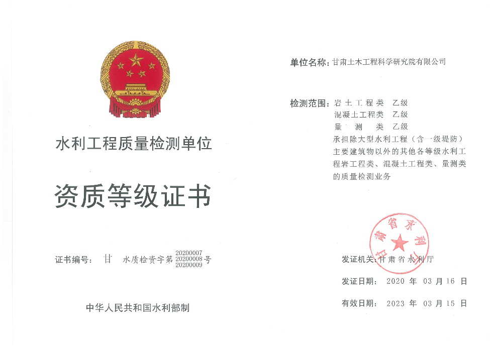 3月16日,公司申報(bào)的水利工程質(zhì)量檢測(cè)資質(zhì)獲得審批,取得巖土工程類乙級(jí)、混凝土工程類乙級(jí)、量測(cè)類乙級(jí)資質(zhì)證書(shū)。