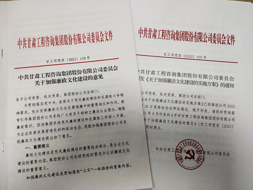 作為新組建的產(chǎn)業(yè)集團,甘肅工程咨詢集團把資產(chǎn)整合、產(chǎn)業(yè)耦合和文化融合作為集團公司組建的重要內(nèi)容,其中讓廉潔文化建設在企業(yè)文化建設中先行一步,早安排早部署,2021年9月集團公司黨委研究印發(fā)《關于加強廉政文化建設的意見》,在中共中央辦公廳《關于加強新時代廉潔文化建設的意見》和省委《實施方案》印發(fā)后,又及時對標、查缺補漏,2022年9月修訂印發(fā)《關于加強廉潔文化建設的實施方案》,為新時代集團公司加強廉潔文化建設提供了指導。自組建以來,集團公司廉潔文化建設力求在“內(nèi)化于心”上下功夫,在“外化于行”上求實效,引導干部職工廉潔從業(yè),廉潔用權,積極營造“崇廉、尚廉、倡廉、守廉”的企業(yè)風尚和發(fā)展氛圍。