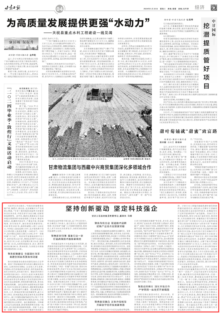 奮進新征程,建功新時代。甘肅工程咨詢集團將堅持和加強黨的全面領(lǐng)導(dǎo),認真落實“兩個一以貫之”,以高質(zhì)量黨建引領(lǐng)高質(zhì)量發(fā)展,錨定建設(shè)先進科技創(chuàng)新體系、打造一流工程技術(shù)集團、推動建成高端咨詢智庫“三位一體”奮斗目標,全面建設(shè)現(xiàn)代科技創(chuàng)新企業(yè)。加快推進管理提升行動,持續(xù)深化管理標桿創(chuàng)建;加快推進價值創(chuàng)造行動,著力增強價值創(chuàng)造能力;加快推進品牌引領(lǐng)行動,不斷提升品牌運營管理水平;加快培養(yǎng)高層次人才,全力打造西北工程技術(shù)重要人才中心和創(chuàng)新高地;加快推進改革創(chuàng)新行動,推動“改革示范工程”更加突出科技屬性、“雙百企業(yè)”持續(xù)優(yōu)化公司治理;加快完善創(chuàng)新文化體系,激發(fā)提振干部職工創(chuàng)新創(chuàng)造活力。努力建設(shè)具有核心競爭力的一流工程技術(shù)產(chǎn)業(yè)集團,為推進中國式現(xiàn)代化甘肅實踐作出新的更大貢獻。