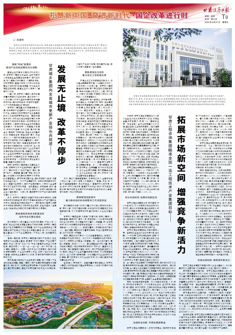 奮進新征程,甘肅工程咨詢集團將全面貫徹落實黨的二十屆三中全會精神,準確把握改革重點任務,持續(xù)推動國有企業(yè)做強做優(yōu)做大,著力提升改革質量和效能,不斷推進黨的建設與生產經營深度融合,聚焦勘察設計主業(yè),大力發(fā)展綠色技術、數字技術等新興產業(yè),加快培育新質生產力,增強高質量發(fā)展動能,加快建設全國一流工程技術產業(yè)集團。