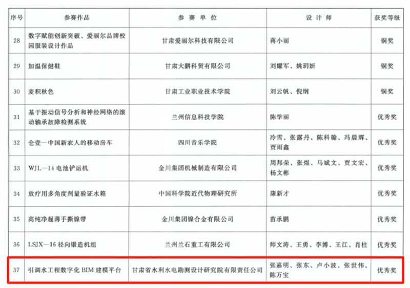在甘肅省第七屆BIM技術(shù)應(yīng)用大賽中,建筑設(shè)計(jì)院、水電設(shè)計(jì)院報(bào)送的項(xiàng)目共斬獲12項(xiàng)獎(jiǎng)勵(lì),包攬了設(shè)計(jì)組16個(gè)獎(jiǎng)項(xiàng)中的10項(xiàng)。在甘肅省第五屆“創(chuàng)新杯”工業(yè)設(shè)計(jì)大賽中,水電設(shè)計(jì)院《引調(diào)水工程數(shù)字化BIM建模平臺(tái)》項(xiàng)目獲優(yōu)秀獎(jiǎng)。在第十七屆全省職工優(yōu)秀技術(shù)創(chuàng)新成果獎(jiǎng)中,水電設(shè)計(jì)院、土木工程院申報(bào)的兩個(gè)項(xiàng)目分獲創(chuàng)新成果獎(jiǎng)三等獎(jiǎng),其中,《棄渣場三維設(shè)計(jì)平臺(tái)》項(xiàng)目是全省水利系統(tǒng)唯一獲獎(jiǎng)成果。