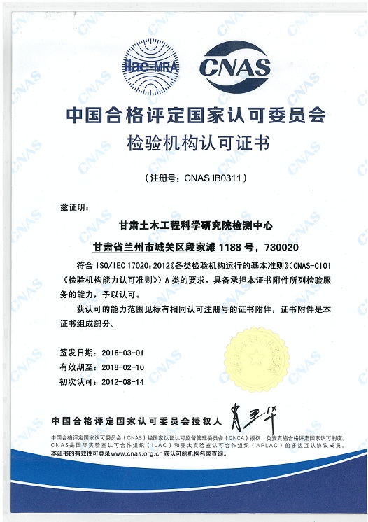 2012年2月首次依據(jù)CNAS-CL01建立了檢驗(yàn)機(jī)構(gòu)質(zhì)量管理體系,2012年8月初次通過國(guó)家檢驗(yàn)機(jī)構(gòu)認(rèn)可,檢驗(yàn)領(lǐng)域?yàn)榻ㄖ鼗?地基、樁基承載力試驗(yàn)與評(píng)價(jià))、建筑結(jié)構(gòu)(工程施工質(zhì)量評(píng)價(jià)、結(jié)構(gòu)設(shè)計(jì)復(fù)核、結(jié)構(gòu)抗震性能評(píng)價(jià)、結(jié)構(gòu)安全性與可靠性評(píng)價(jià))、建筑節(jié)能(圍護(hù)結(jié)構(gòu)節(jié)能性能施工質(zhì)量及評(píng)價(jià)、建筑物能耗及節(jié)能綜合指標(biāo)評(píng)價(jià))、混凝土(混凝土配合比質(zhì)量評(píng)定、混凝土質(zhì)量和生產(chǎn)過程質(zhì)量控制評(píng)定)。歷經(jīng)監(jiān)督檢查,換證復(fù)評(píng)審,持續(xù)有效運(yùn)行5年。