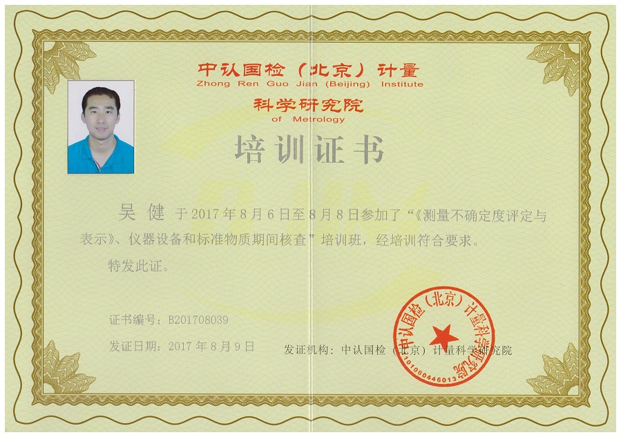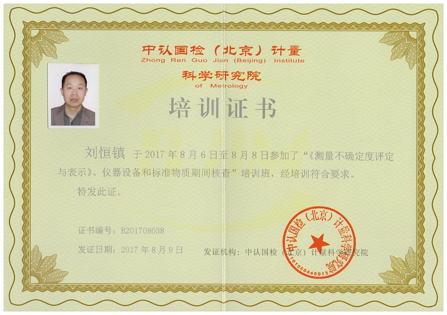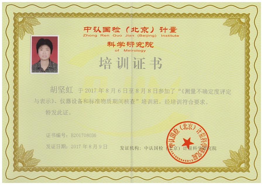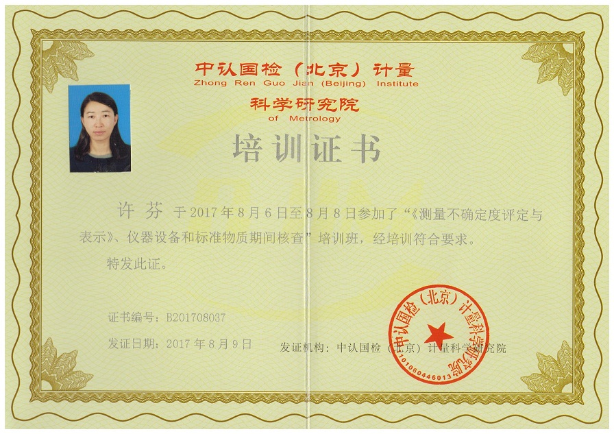 為了加強(qiáng)我院的測量不確定度及標(biāo)準(zhǔn)物質(zhì)期間核查的能力,我院選派了胡堅(jiān)虹、劉恒鎮(zhèn)、吳健、許芬四位技術(shù)人員參加了于2017年8月6日在廈門八山酒店開展的“新版《測量不確定度評價與表示》、儀器設(shè)備和標(biāo)準(zhǔn)物質(zhì)期間核查”的培訓(xùn)學(xué)習(xí),培訓(xùn)為期三天,并獲得了由中認(rèn)國檢(北京)計量科學(xué)研究院頒發(fā)的培訓(xùn)證書。